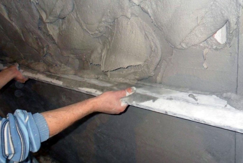 Следователно, след като проверите геометрията на повърхността с правилото, те пристъпват към мазилка. Ако се предвижда максималният слой да бъде повече от 3 см, тогава стената също ще трябва да бъде подсилена със строителна мрежа или дори измазана над фаровете.