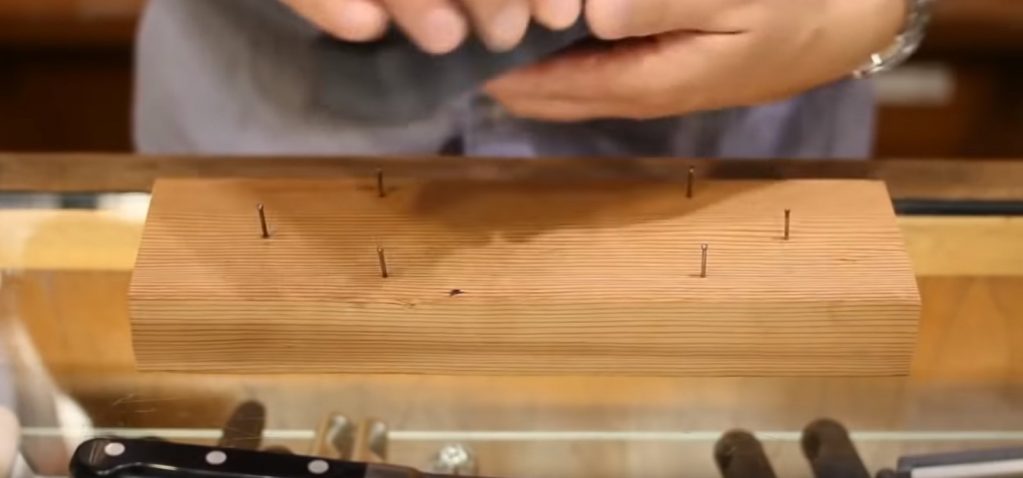 Резето е обикновена дъска, в която се забиват 6 малки пирона за сигурно фиксиране на камъка.