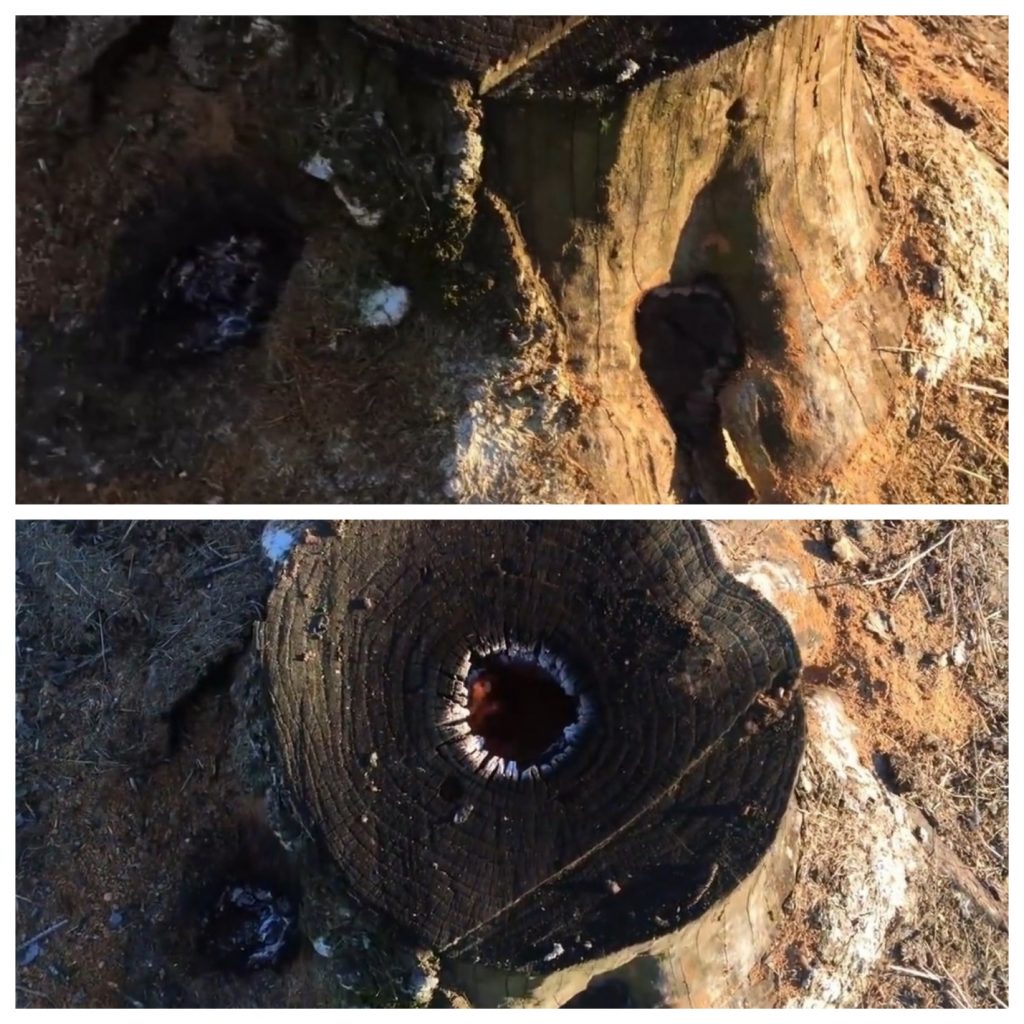 Почти целият пън е изгорял, но вътре все още има корени. Следователно е възможно, като хвърлите сухи дърва отгоре, да ги изгорите и те.