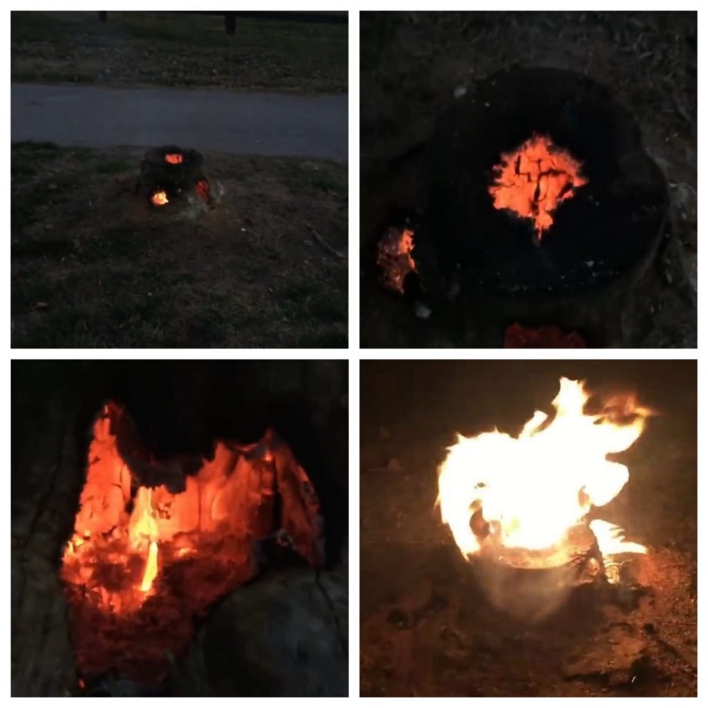 През нощта пънът изгаряше няколко часа, след това малко утихна и по-близо до сутринта просто тлееше. Ето какво се случи с него 12 часа след като го запалиха. От него на практика не е останало нищо.
