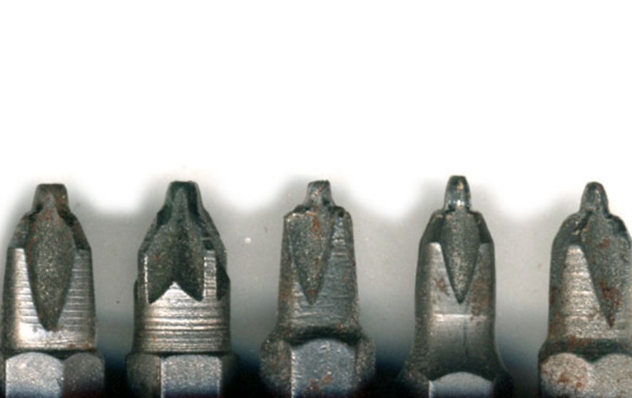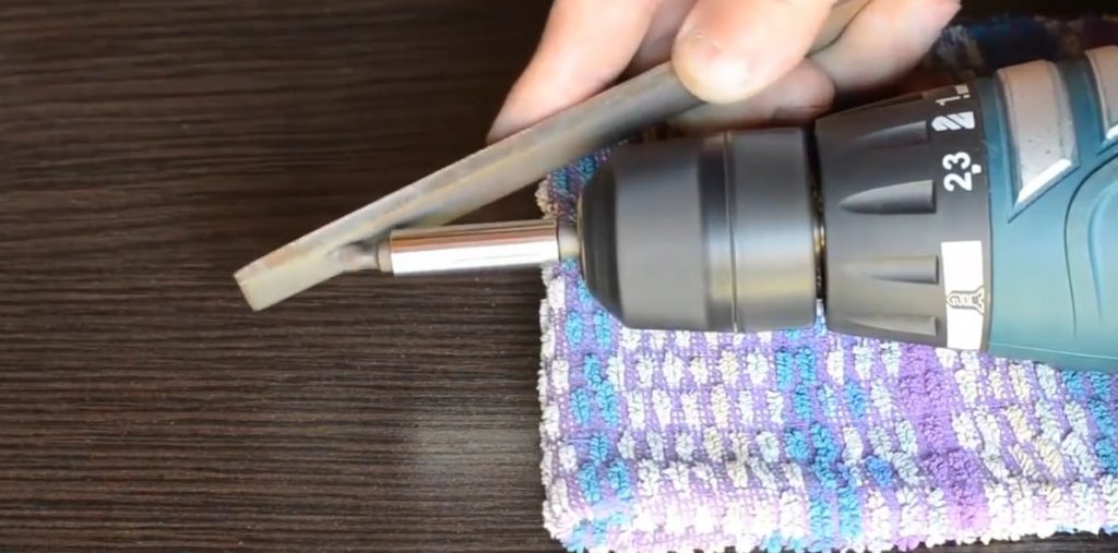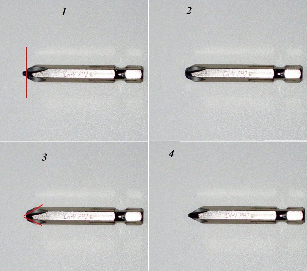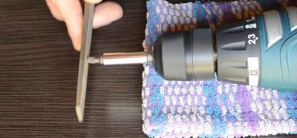 След поддържане на ъгъл от приблизително 30 градуса спрямо накрайника, ръбовете му се обработват. Носът на накрайника е твърде широк и няма да влезе в жлебовете на винтовете, така че трябва да бъде заточен.