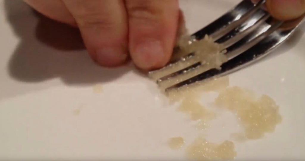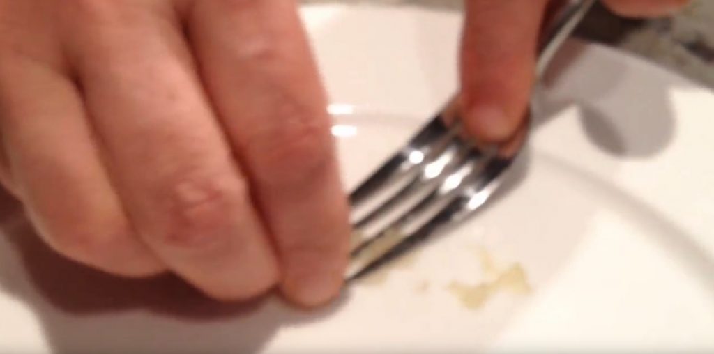 A continuació, es mou l'all d'anada i tornada de manera que toqui les puntes de la forquilla, mentre s'enganxa lleugerament a les dents i al fons del plat.