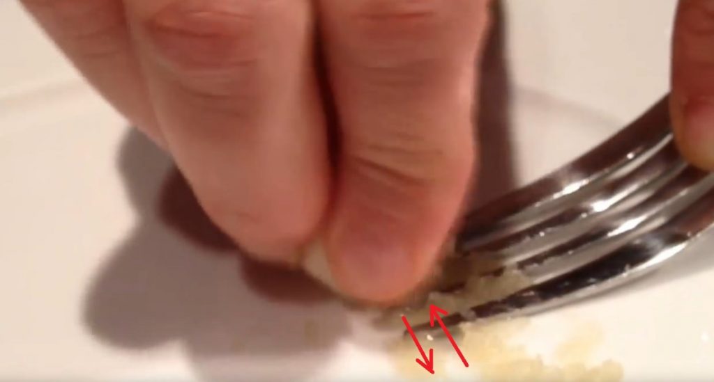 Es pren un gra d'all a la mà dreta i es posa a la punta de la forquilla.