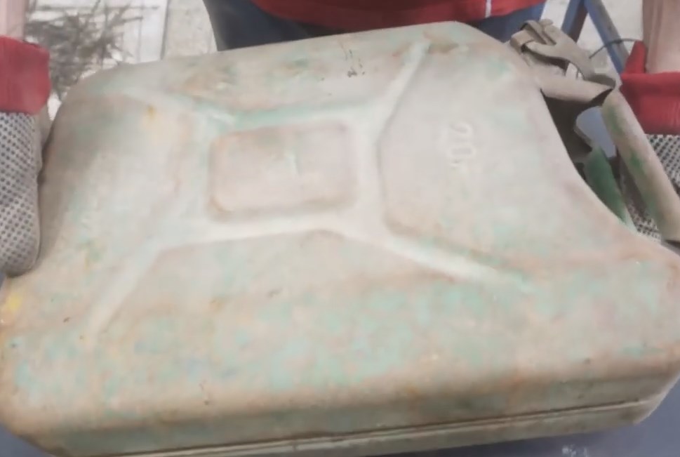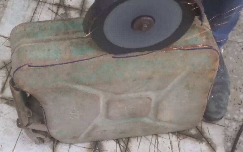 Po obvodu kanystru jsem označil místo řezu a boční stěnu odpiloval bruskou.