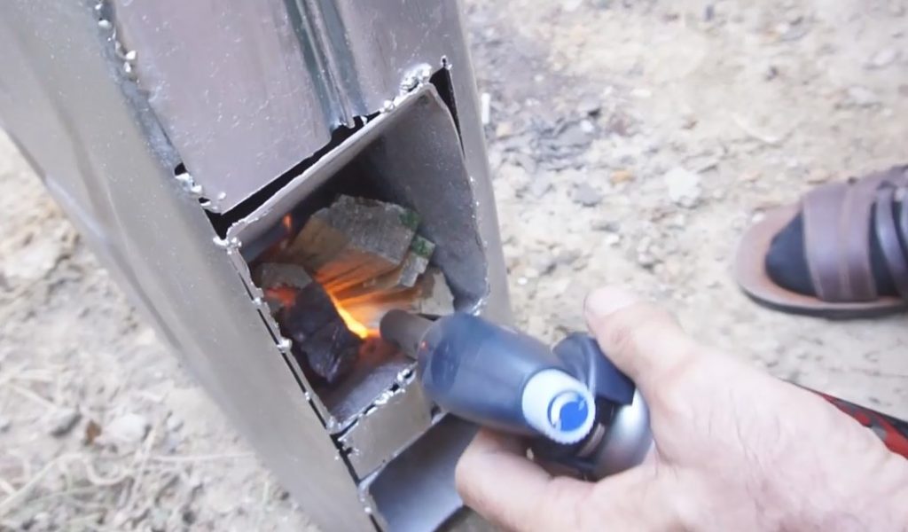 Měl jsem přípravu. Pokud ne, můžete vyrobit něco podobného. Topeniště je umístěno diagonálně, spodní potrubí slouží jako dmychadlo a rošt a horní slouží jako komín a zdroj ohně na vaření. Tento design funguje.