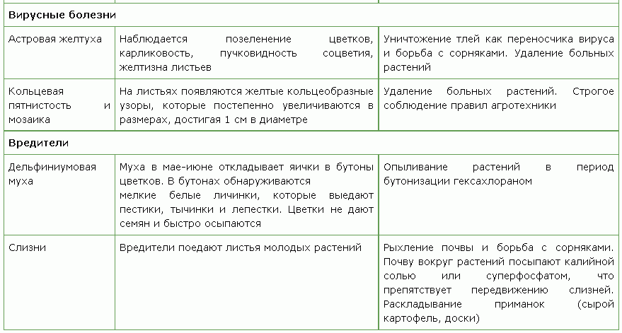 Nemocí je mnoho. Většina z nich je důsledkem nepříznivých povětrnostních podmínek., ale dodržování pravidel zemědělské technologie při pěstování delphinia může minimalizovat riziko onemocnění.