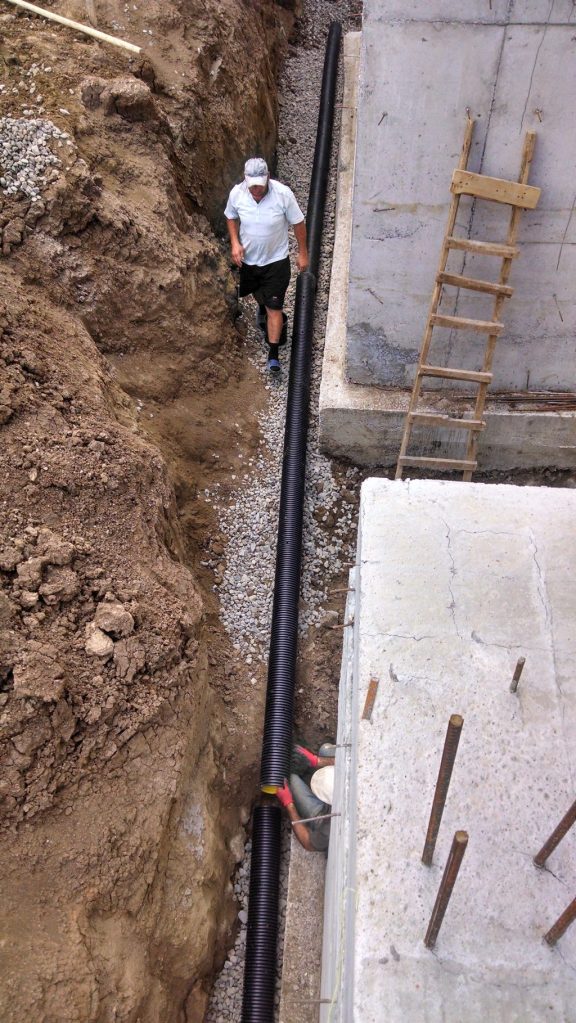 Po celé délce plastových trubek jsou nahoře vyvrtány otvory, aby do nich mohla vnikat voda. Po propojení trubek k sobě jsou pokryty vrstvou suti.
