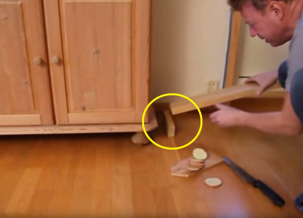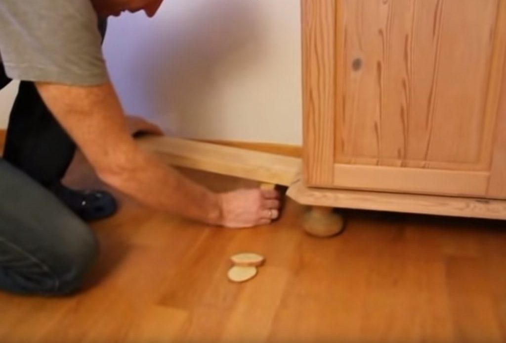 Zvednutím jedné ze stran skříně jsou pod její nohy umístěny hrnky na brambory.
