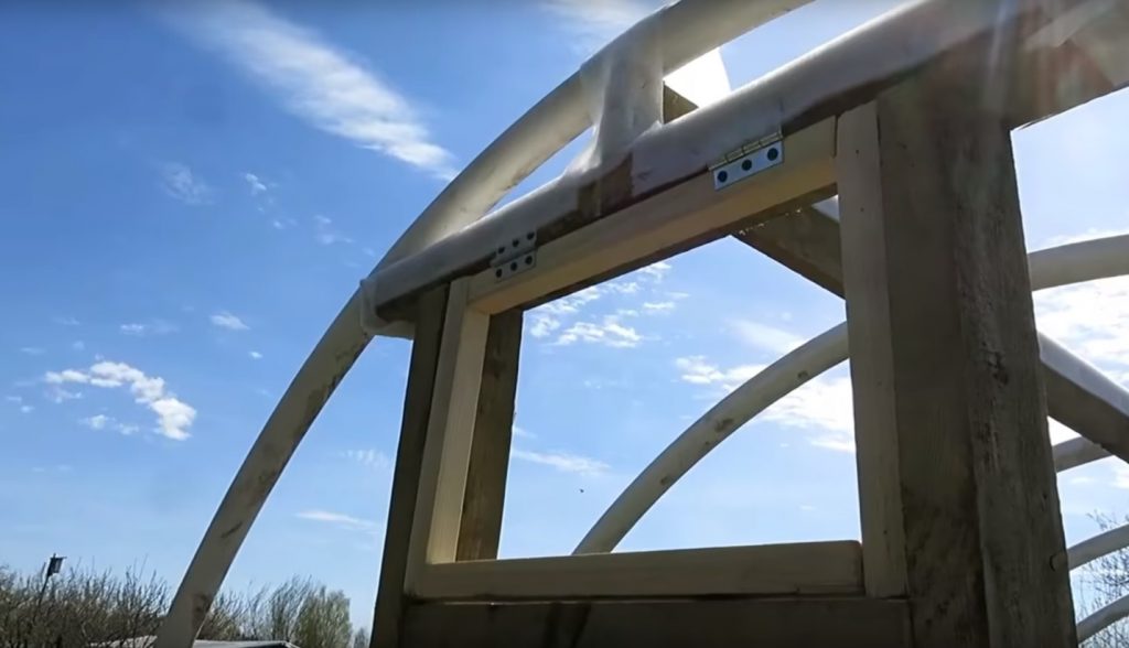 Otvor je vyroben ze stejných tyčí jako základna skleníku. Můžete použít tenčí tyče, ale je lepší to nedělat, protože otvor nebude sloužit pouze jako dveře do skleníku, bude součástí jeho nosné konstrukce. Na hřeben, který se opírá o otvory, budou připevněny plastové trubky, které budou použity jako stěny budoucího skleníku.