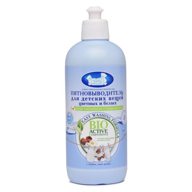 Dětský odstraňovač skvrn "Naše máma" je pro pohodlí k dispozici ve formě tuby s dávkovačem. To usnadňuje aplikaci. Vhodné pro bílé i barevné věci.