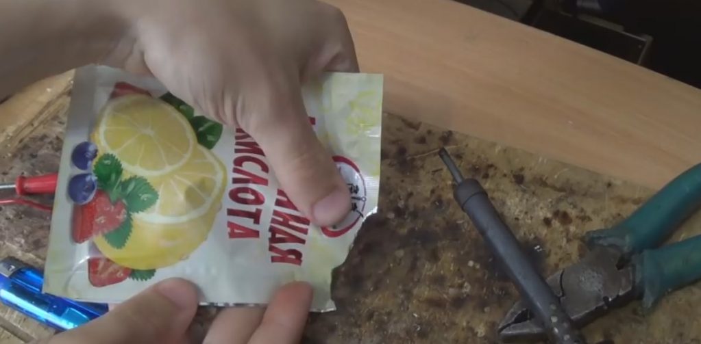 Začátečník se možná bude divit, ale tohle je obyčejná kyselina citronová. Jedná se o poměrně silnou kyselou látku a úspěšně odstraňuje oxidy a nečistoty z kovového povrchu. Mimochodem, s jeho pomocí se odstraní rez ze starého kovového nástroje, obnoví se pilníky a jehlové pilníky.
