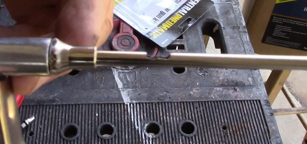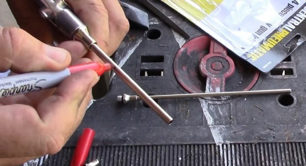 Na trysce pulvizátoru uděláme značky pro otvor. Proteče jím abrazivo. Ve vzdálenosti 3 cm od bodu upevnění trubice trysky si označíme asi 2 cm.