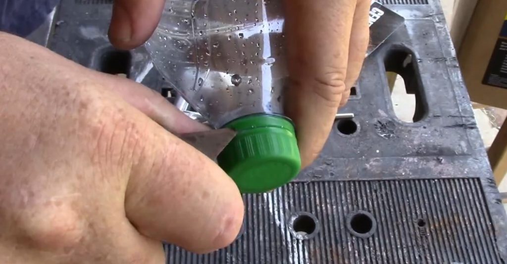 Vezmeme plastovou láhev o objemu 0,5-1 litru a pomocí kancelářského nože odstraníme okraj fixující korek. Můžete si vzít větší láhev, ale bude těžké ji udržet.