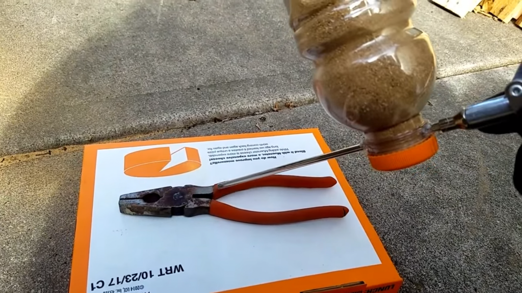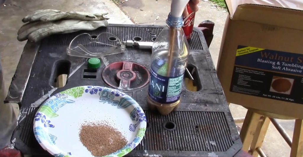 Nalijte abrazivo do pískovací nádoby (láhve). Nejlepším typem takového nástroje je brusivo vyrobené ze skořápek vlašských ořechů. Lze použít i písek, ale ten rychle „sežere“ špičku tuby.