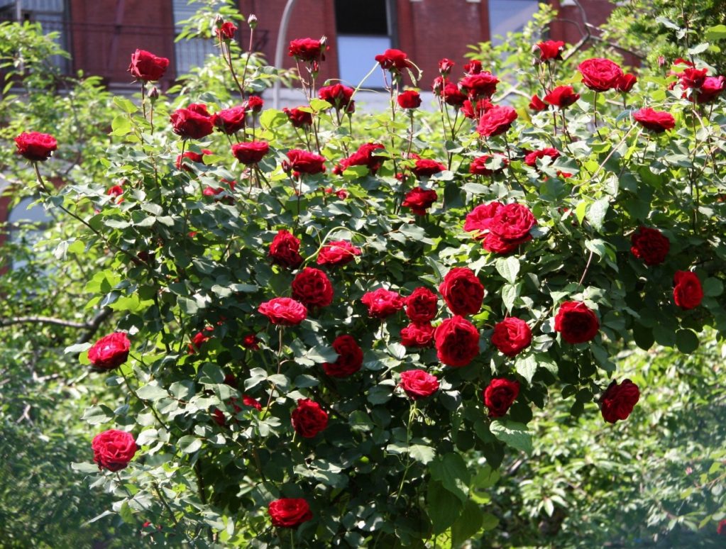 Mohutný vysoký keř dosahující 3 m výšky a 2 m objemu. Květy jsou šarlatové, dvojité, 10-11 cm v průměru, velmi vonné. Kvete nepřetržitě po celou letní sezónu. Rostlina odolává mrazům do -25°C.