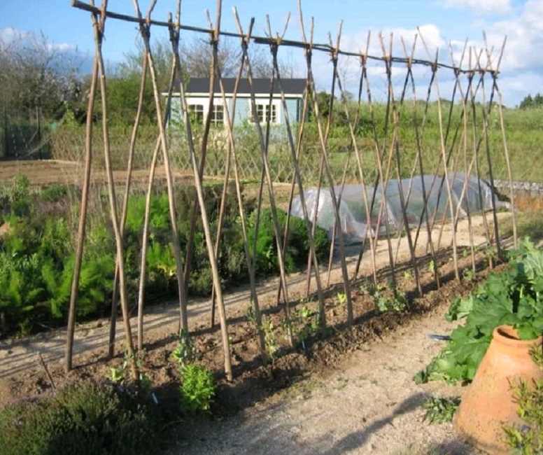 Rozměry jsou stejné jako u jednorovinových podpěr. Výška je asi 2 m, tyče se instalují každých 3-6 m, přičemž mezi řadami je ponechán prostor asi 4 m.