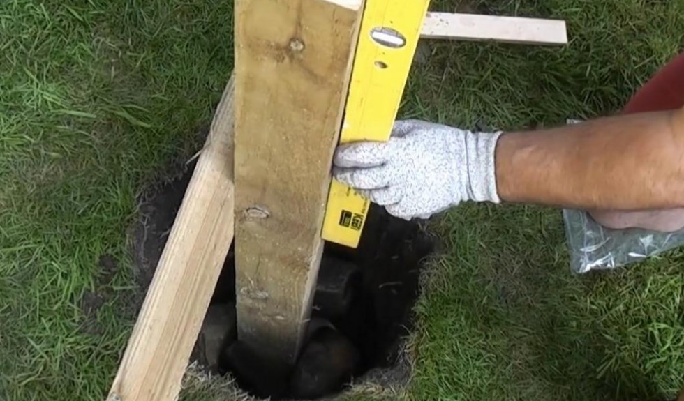 Upevnění sloupu úlomky cihel nebo kamene. To se provádí pro primární fixaci kolony a také pro snížení spotřeby směsi písku a cementu.