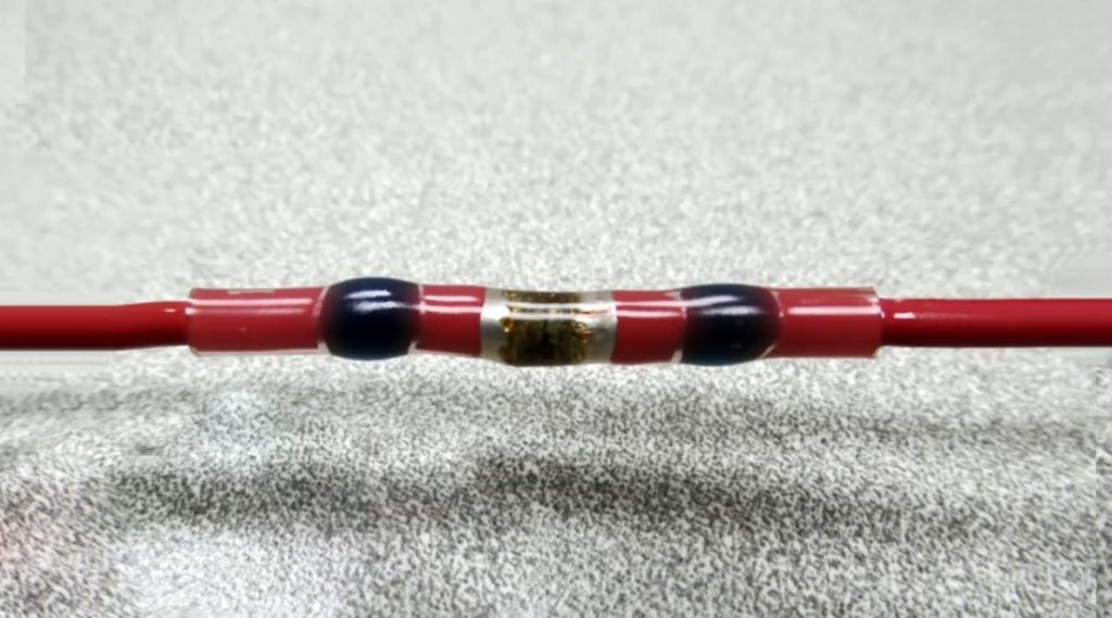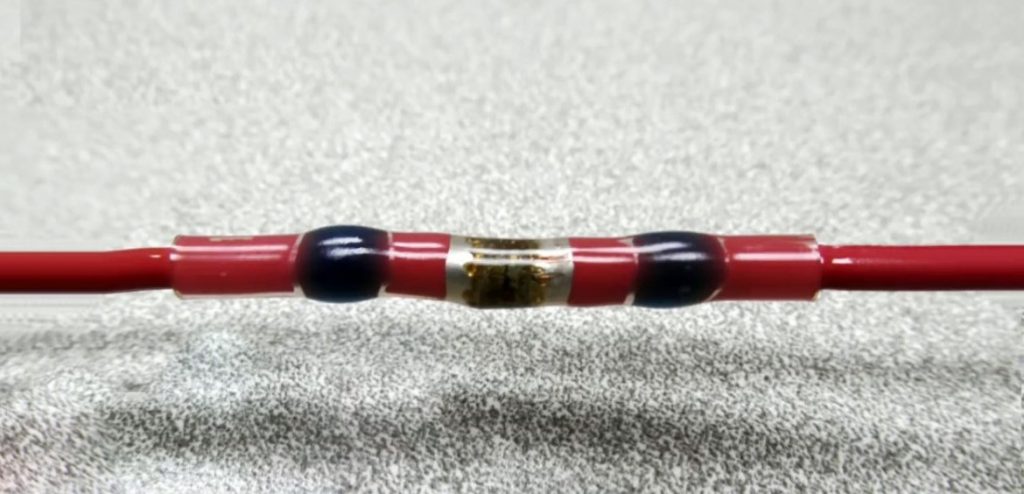 La idea era combinar los procesos de soldadura y aislamiento de cables en una sola acción, y resultó. Para soldar, se usa una temperatura de aproximadamente 200 ° C, y la contracción por calor puede soportar temperaturas mucho más altas; por lo tanto, los desarrolladores de esta innovación colocaron un elemento adicional que contiene soldadura con fundente en el segmento de contracción por calor.