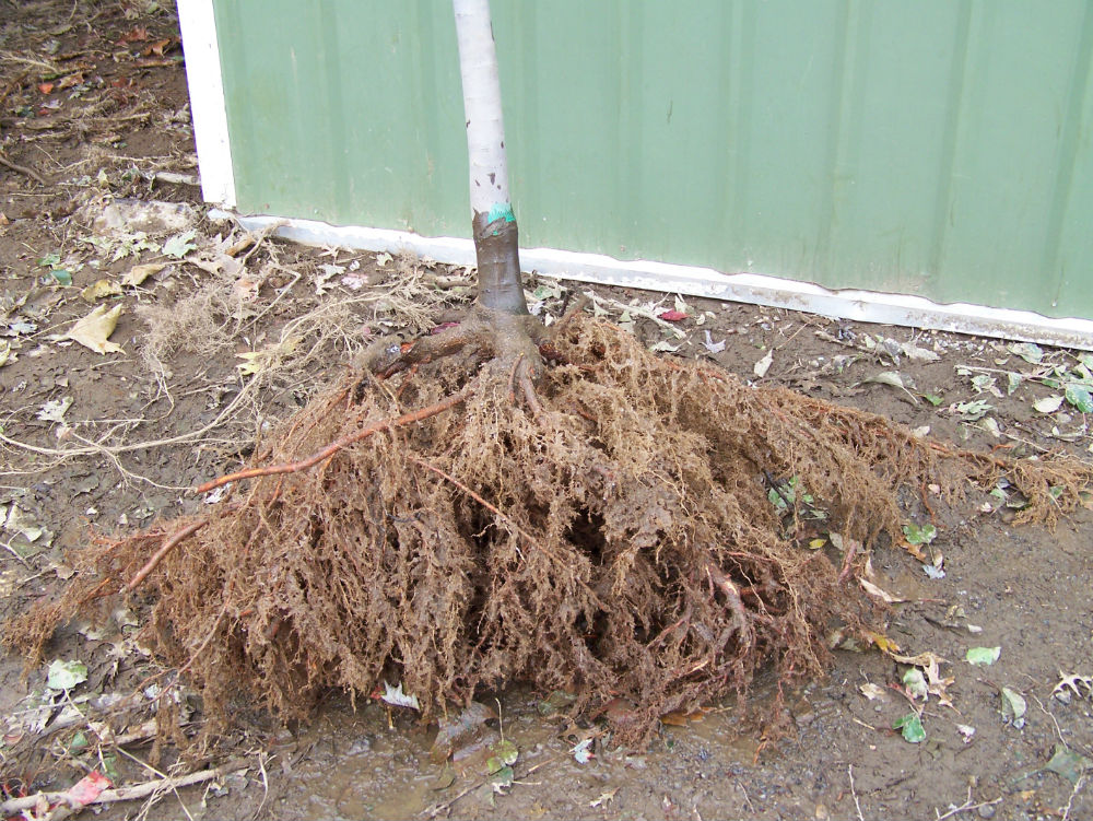 - El árbol sube cuidadosamente por la parte basal del tallo. La liberación libre del tanque indica un trasplante de larga data y un sistema de raíces bien desarrollado durante este tiempo. Las plántulas recién trasplantadas en áreas de cultivo tienen sus raíces recortadas para que quepan en una maceta de envío