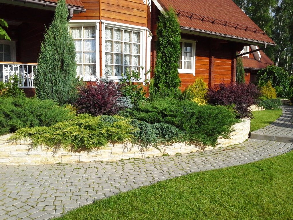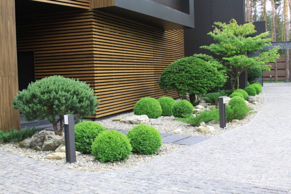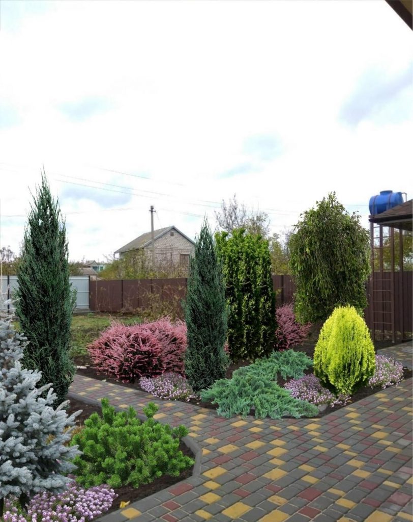 En el jardín de hoja perenne al estilo del minimalismo, las plantaciones de coníferas son el solista. Su variedad es tan grande que puedes recoger pequeños enebros, y abetos y arbustos esponjosos en forma de cono resistentes a los cambios bruscos de temperatura.