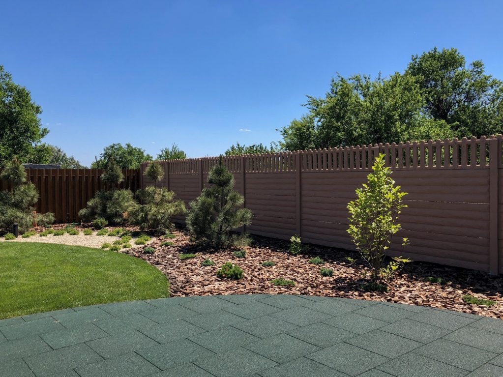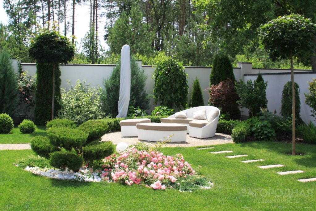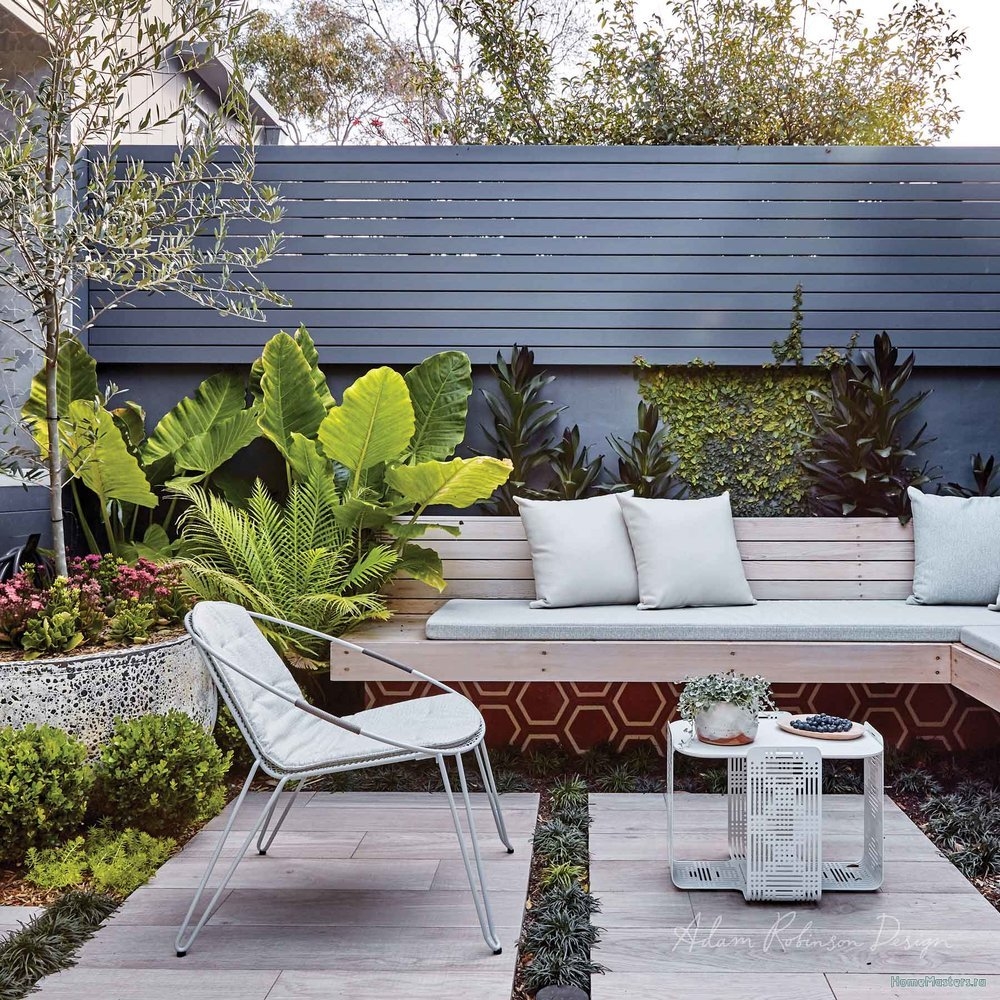Zona de estar moderna para zonas urbanas estrechas. Está ubicado al final del sitio y está enmarcado por una cerca vertical alta. Para separar el área del propio jardín, se construyó un podio.