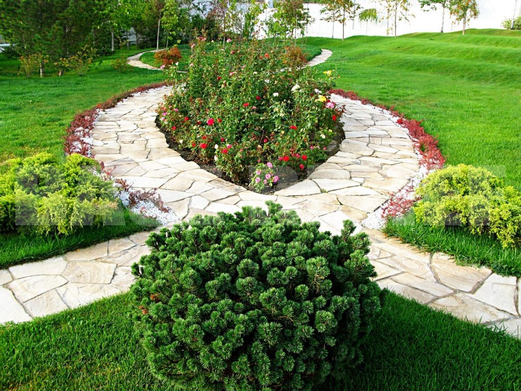Los caminos suaves en el jardín son adecuados para organizar una zona peatonal. Es agradable caminar a través de ellos. macizos de flores en flor y admirarlos. Dichos caminos se pueden combinar, hechos de tejas, madera, cortes de sierra, guijarros y grava.