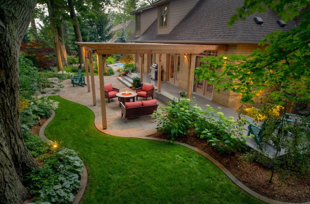 Un ejemplo de la disposición ideal de un área de recreación en el patio trasero. En un sitio, se construyen 4 mini-zonas, que le permiten cocinar alimentos sin moverse largas distancias, calentarse junto al hogar y cenar en un día soleado y nublado.