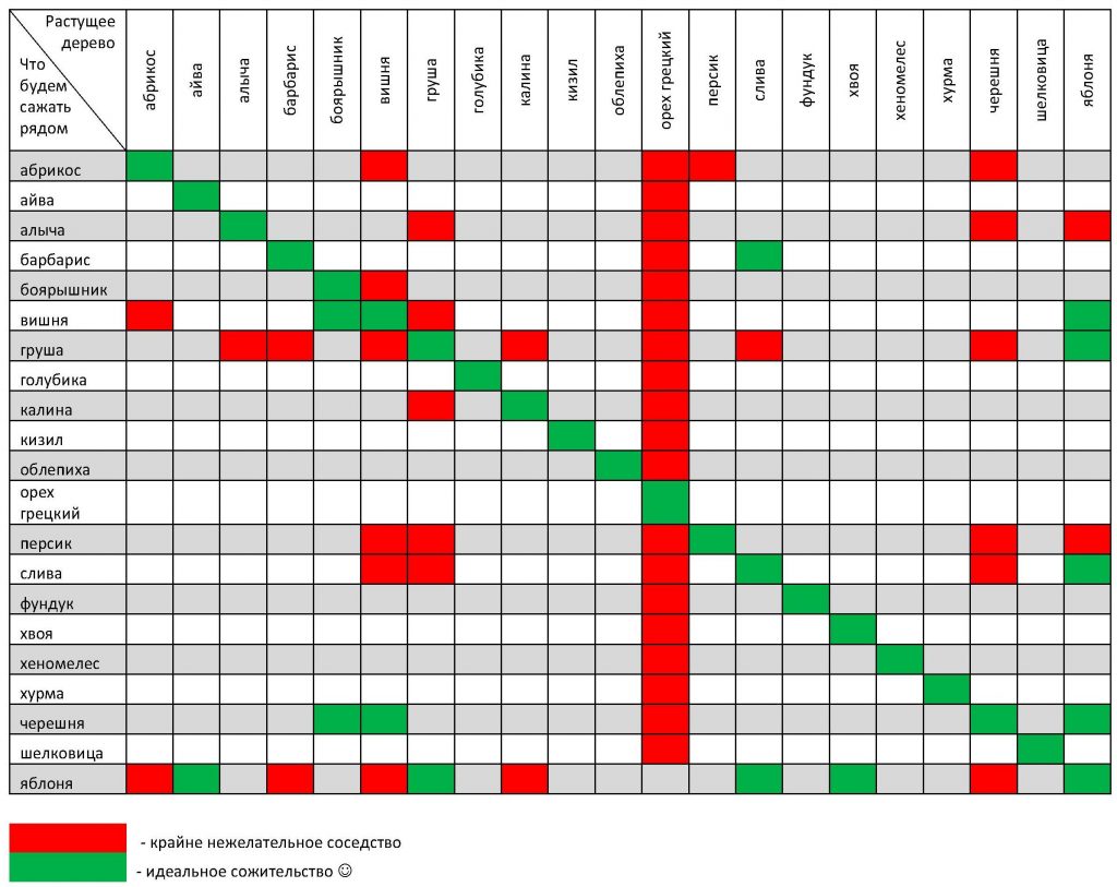 Por ejemplo, cereza Incompatible con peras, algunos manzanos y alguna grosella. Y el manzano no echa bien raíces cerca del nogal, del melocotonero y del cerezo (bueno, el cerezo también). La ciruela es incompatible con casi todos los cultivos, a excepción de algunos tipos de manzanos. La madreselva no combina bien con grosellas y frambuesas, etc.