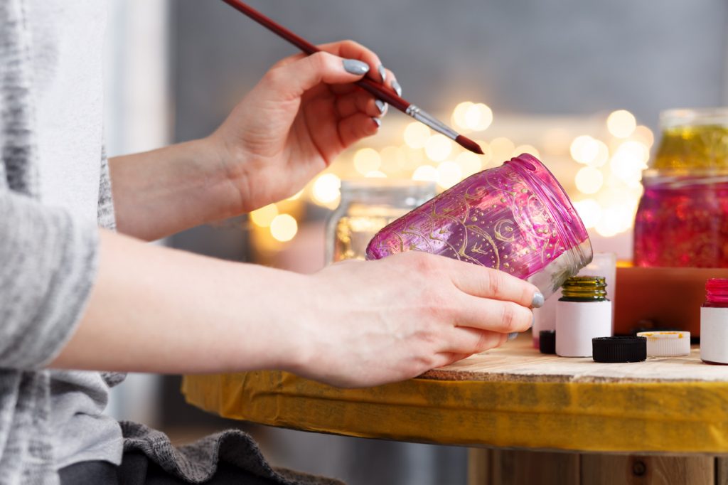 Las botellas cortadas están pintadas de diferentes colores, con guantes protectores en las manos. Al teñir, primero sostenga la botella por el cuello y, cuando la parte inferior se seque, cubra el cuello de la botella con pintura. Para que la pintura se distribuya uniformemente sobre la superficie interna del vidrio, agita la botella.