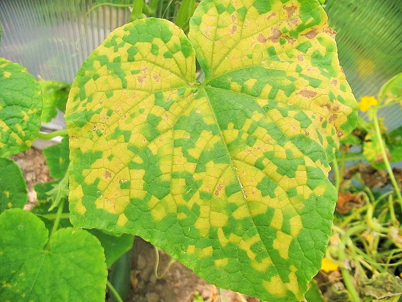 Syy: Kurkkumosaiikkivirus (CMV). Useimmiten kasvihuoneissa, avoimella kentällä on käytännössä passiivinen.