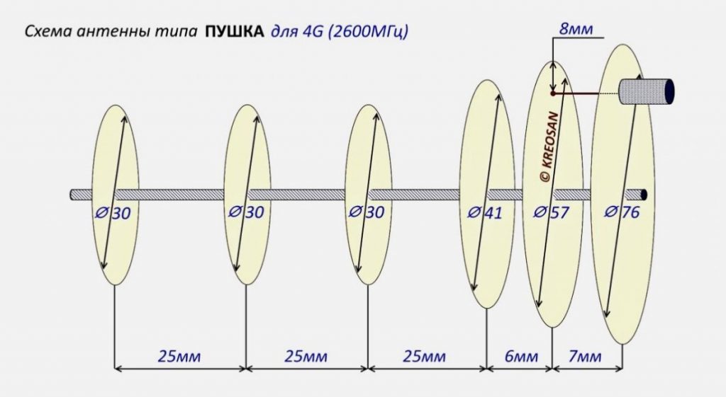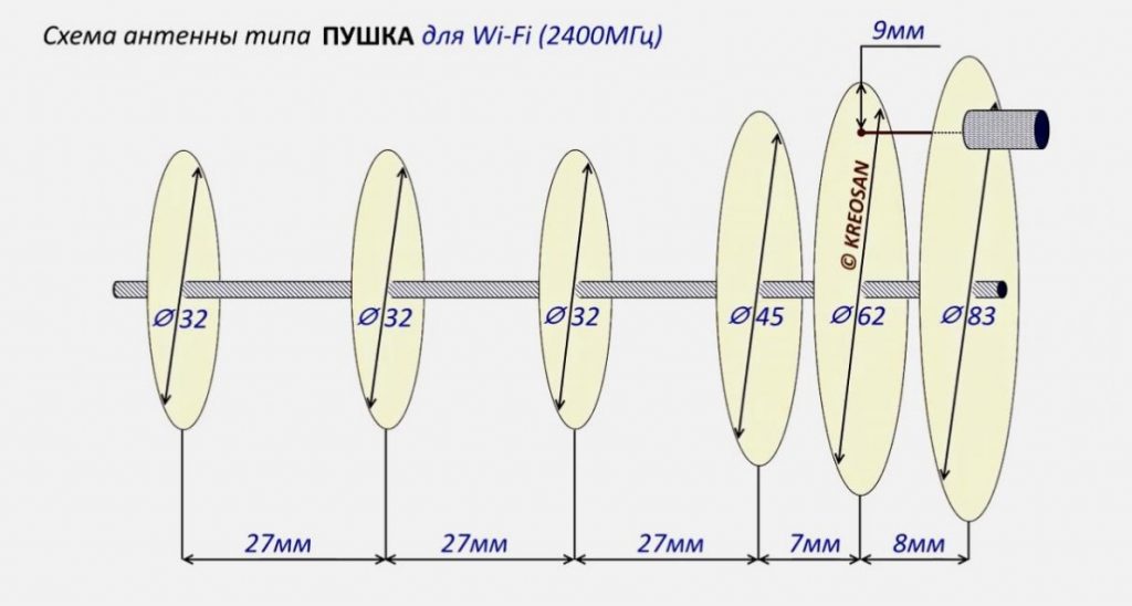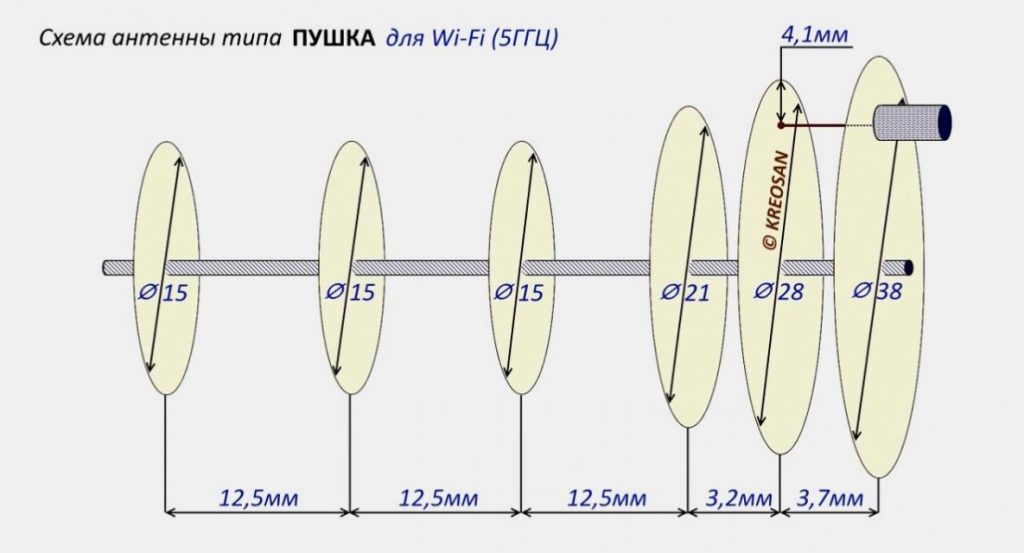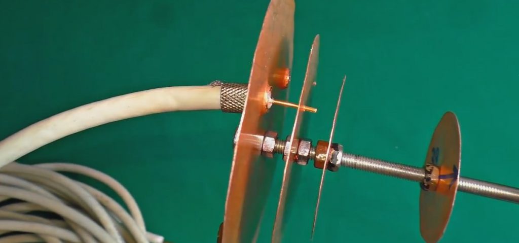 Aseen antenni koostuu 6 pyöreästä kuparielementistä, jotka on kiinnitetty kierreholkkiin tietylle etäisyydelle toisistaan.. Etäisyys lasketaan tietyn radiosignaalin pituuden perusteella. Ensimmäiset neljä ympyrää (halkaisijaltaan pienemmät) tulevat resonanssiin radioaallon kanssa ja vahvistavat sitä. Viimeinen, suurin ympyrä heijastaa radioaallon takaisin, ja se kerääntyy toiseksi viimeiseen kuparielementtiin.
