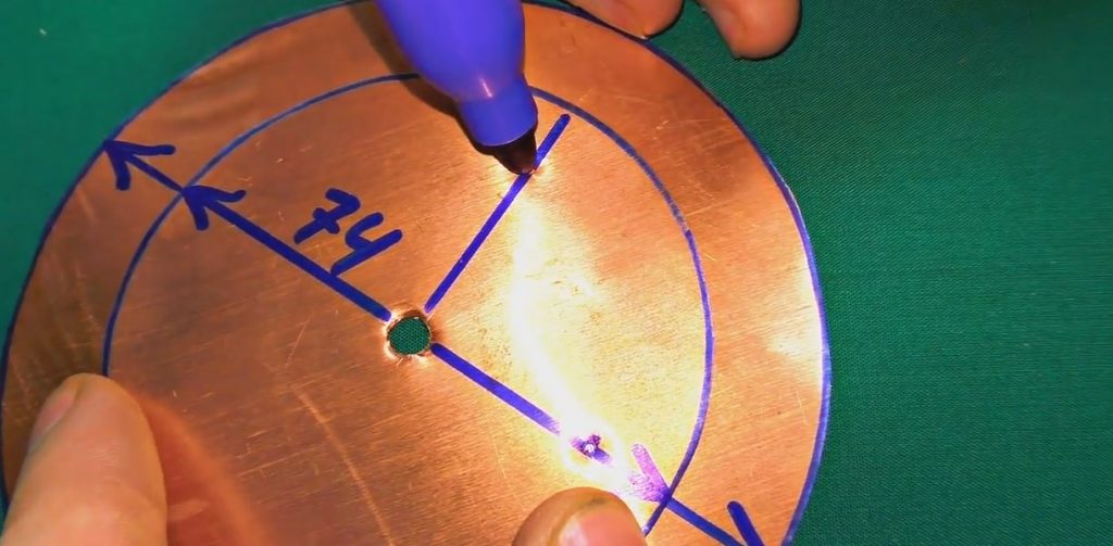 Seuraavaksi merkitsemme antennin liitokset koaksiaalikaapeleilla. Tätä varten merkitsemme toiseksi viimeisen ympyrän R74 - vetäydymme 11 mm ympyrästä. Tällaisia merkkejä on tehtävä 2 kappaletta, kun taas niiden tulee olla tiukasti kohtisuorassa sädettä pitkin.