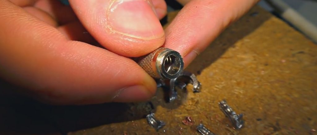 Puhdistamme koaksiaalikaapeleiden päät. Asetamme valmistettuihin liittimiin. Kaapeleiden keskijohtimien tulee mahtua R74-ympyrän reikiin (2 mm).