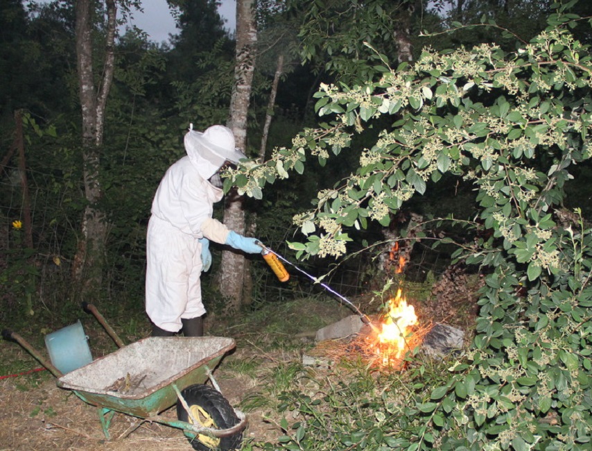 Tämä on nopein ja tehokkain tapa. Se on turvallisin ihmisille. Sitä ei kuitenkaan aina voida soveltaa. Vain puissa, maassa, kiviseinillä tai kivirakennusten sisällä olevia pesiä saa polttaa.