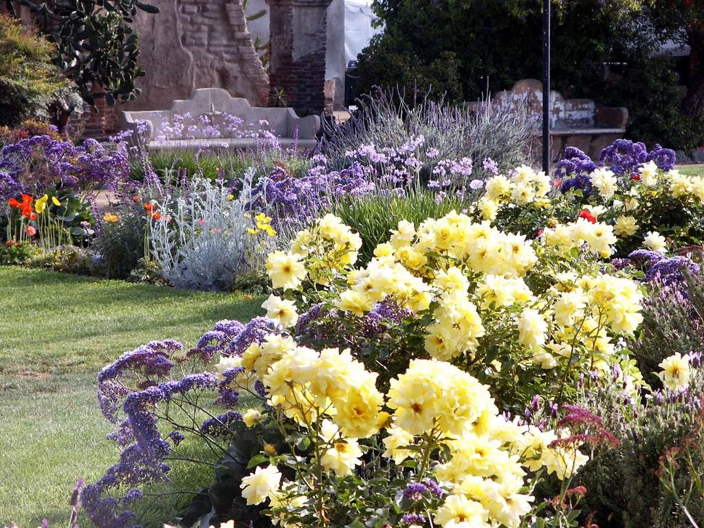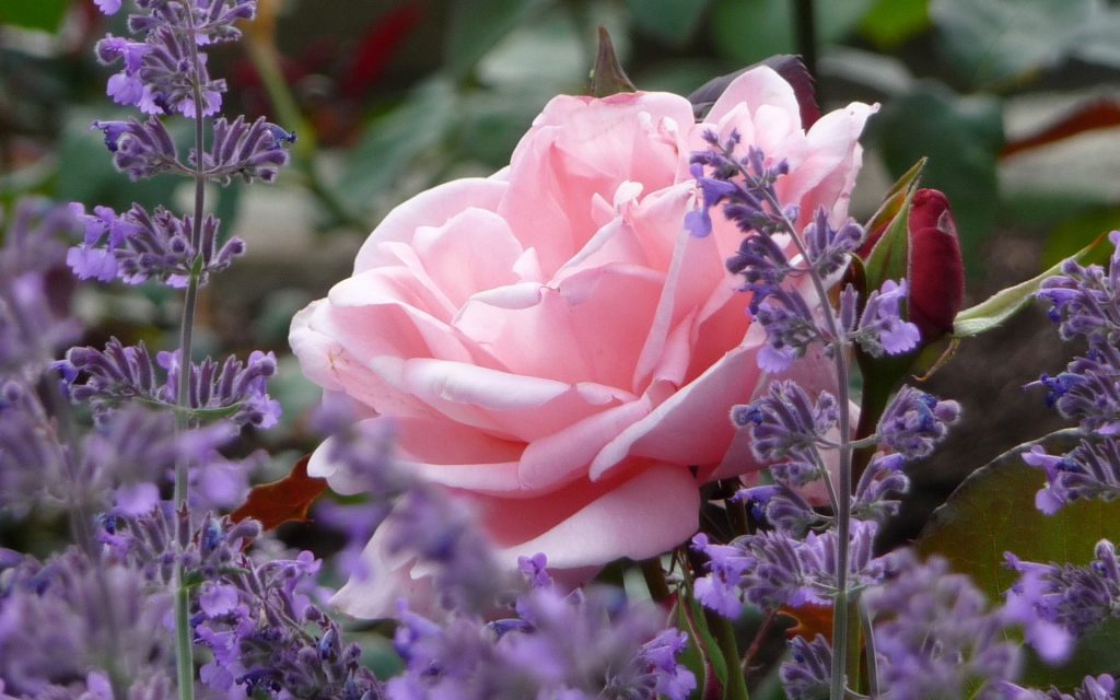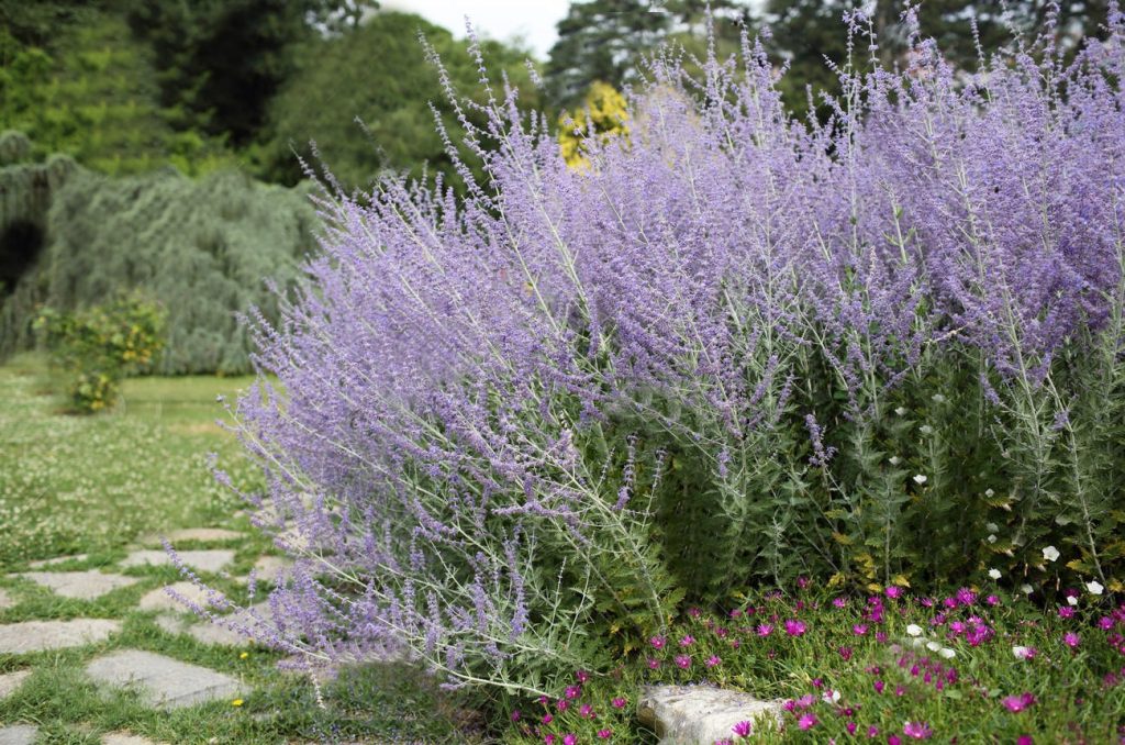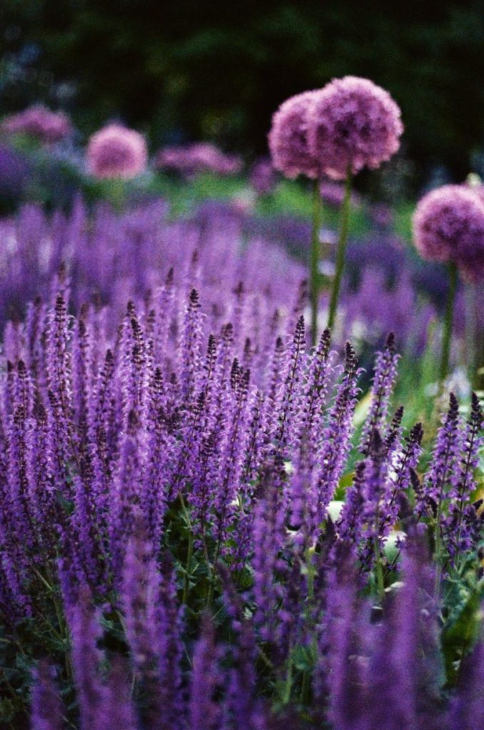 Herkät violetit piikit, jotka ympäröivät suuria ruusunpuja, luo harmonisen ilmeen kukkapenkkeihin puutarhan aurinkoisimpiin kulmiin.