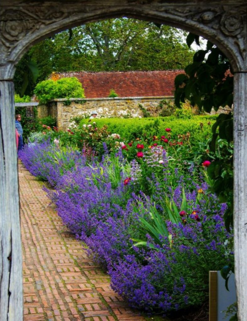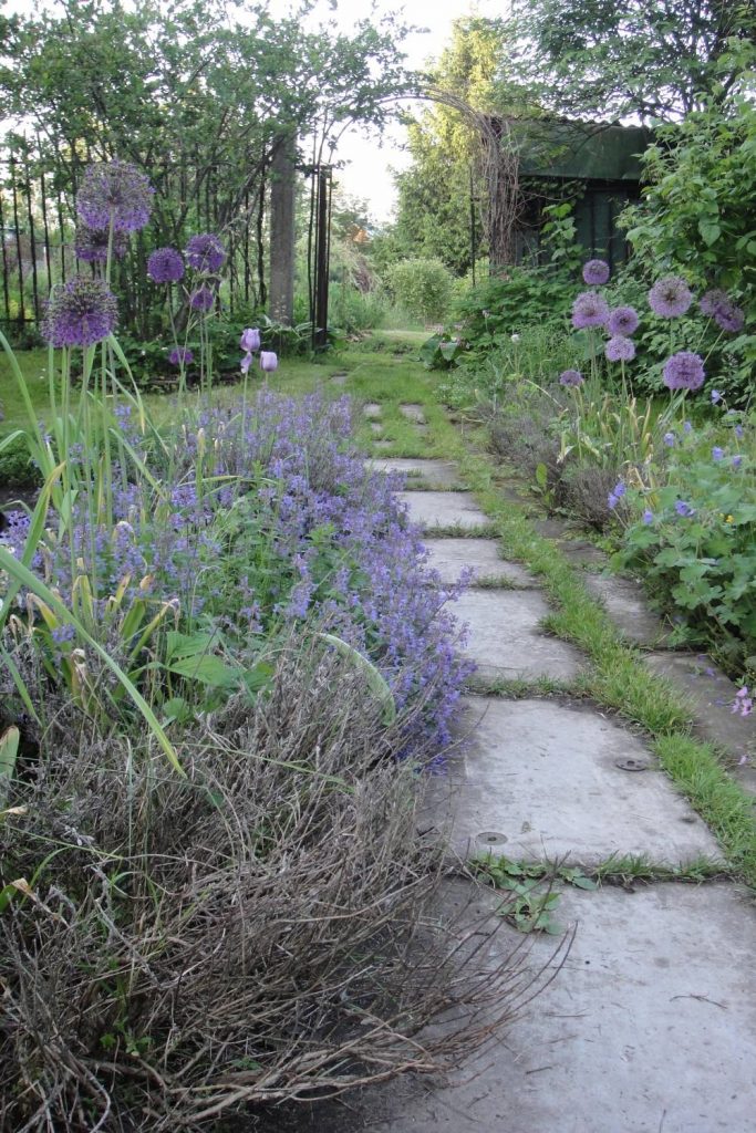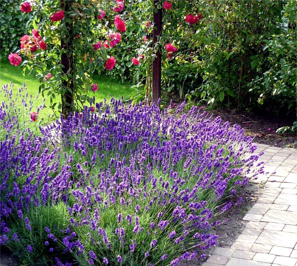Hienostunut, viehättävä muotoilu pehmeän lila-sävyisistä laventelipensaista luodaan reunuksiin. Jokainen, joka kävelee tällaisia kauniita puutarhapolkuja pitkin, saa todellista nautintoa, mielenrauhaa ympäröivästä herkästä aromista.