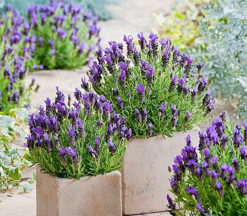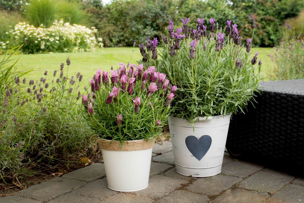Laventelipensaat istutettu astioihin ne näyttävät erittäin lempeiltä, hienostuneilta.