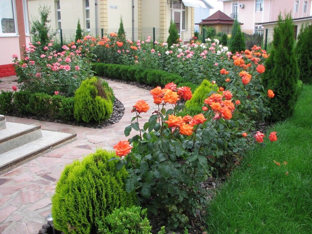 Se näyttää upealta kukkapenkissä, jossa on vaaleanpunaisia ruusuja.