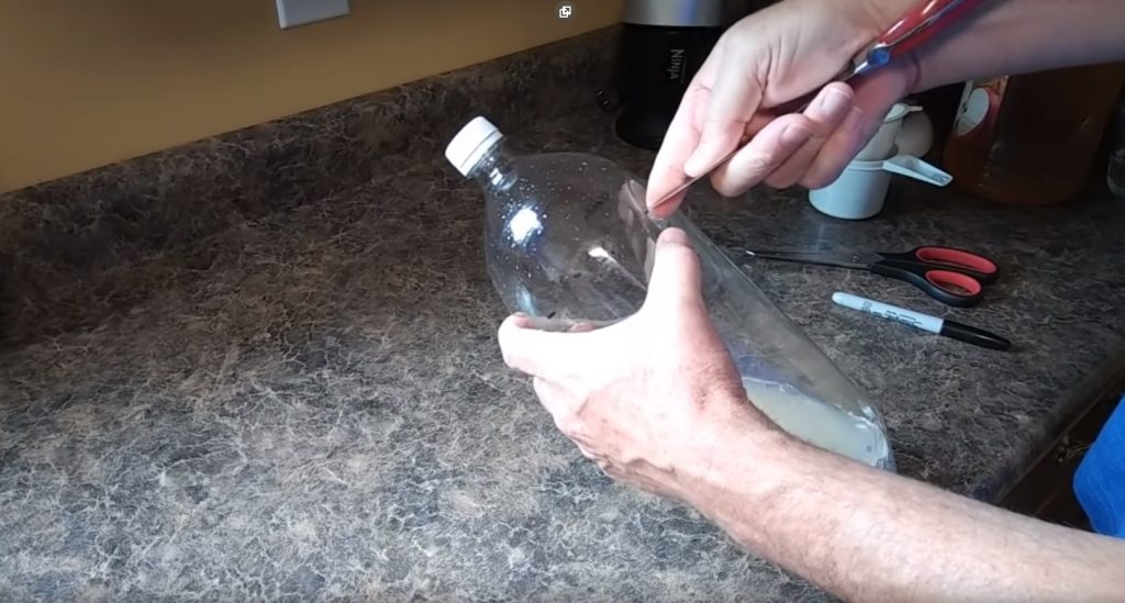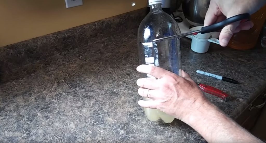 Muovipullossa olevaa merkkiä käyttämällä hahmotellaan leikkausviiva. Pullon yläosa on suositeltavaa leikata pois, jolloin sen rungosta 1-1,5 cm vangitaan, missä muovi ei ole vielä alkanut kapeutua kaulaa kohti.
