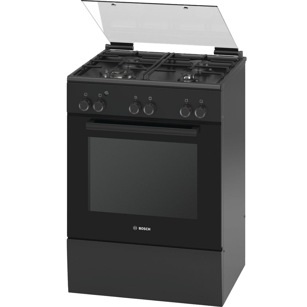 Bosch HGL128I60R -mallissa on komposiittivalurautainen ritilä astioille, lasinen keittotason kansi ja 2 leivinlevyä. Polttimet muunnetaan nesteytetyksi kaasuksi erityisten suuttimien avulla. Mukavaa käyttöä varten on osa astioille, jalat ovat korkeussäädettävät.