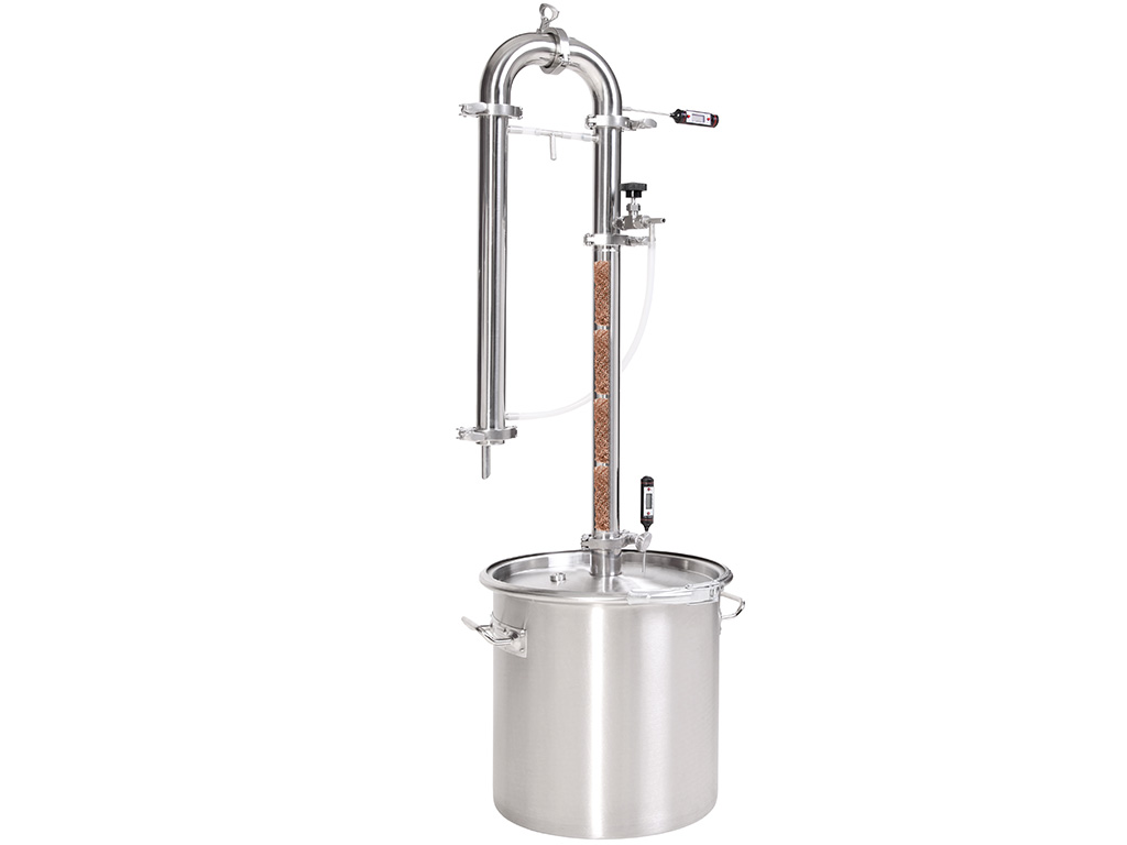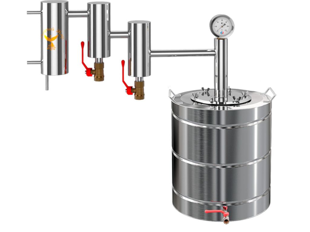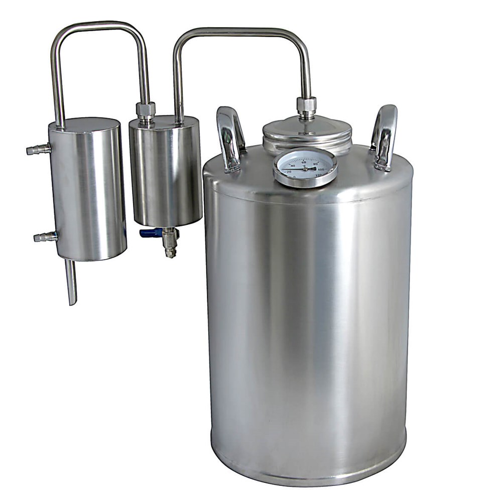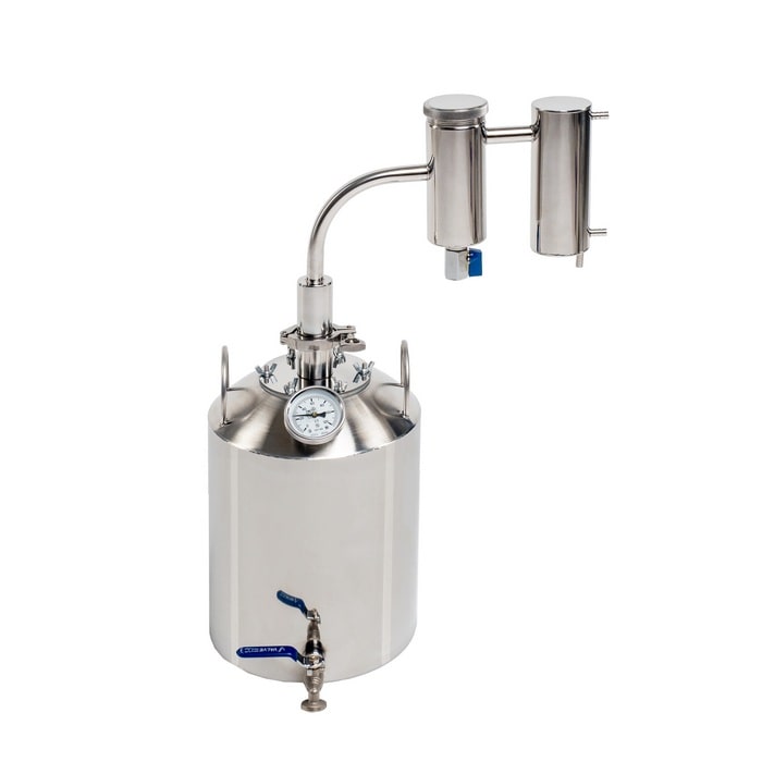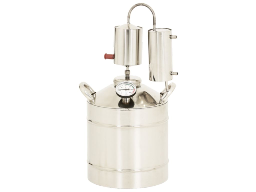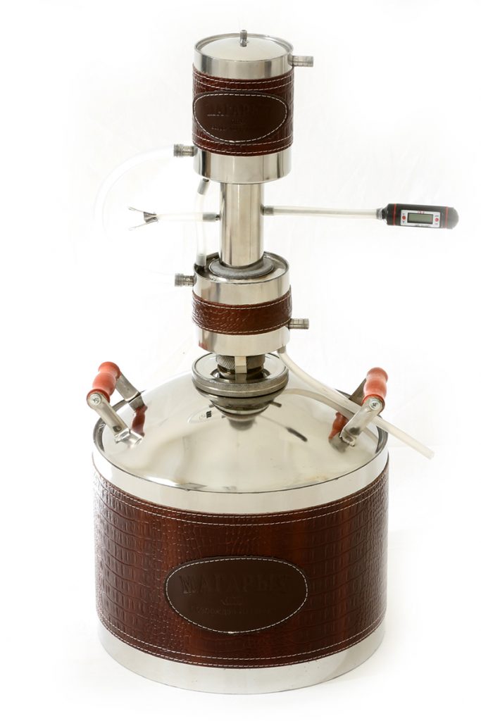 Moonshine-astia irrotettavalla höyrystimellä, valmistettu hypoallergeenisesta AISI 304 ruostumattomasta teräksestä, seinämän paksuus 1 mm. Laitteen lämmittämiseen ei sovellu vain sähkö- / kaasuliesi, vaan myös lasikeramiikka ja jopa tuli. Sarja sisältää bimetallisen lämpömittarin, joka säätelee nesteen haihtumislämpötilaa tislausprosessin aikana.