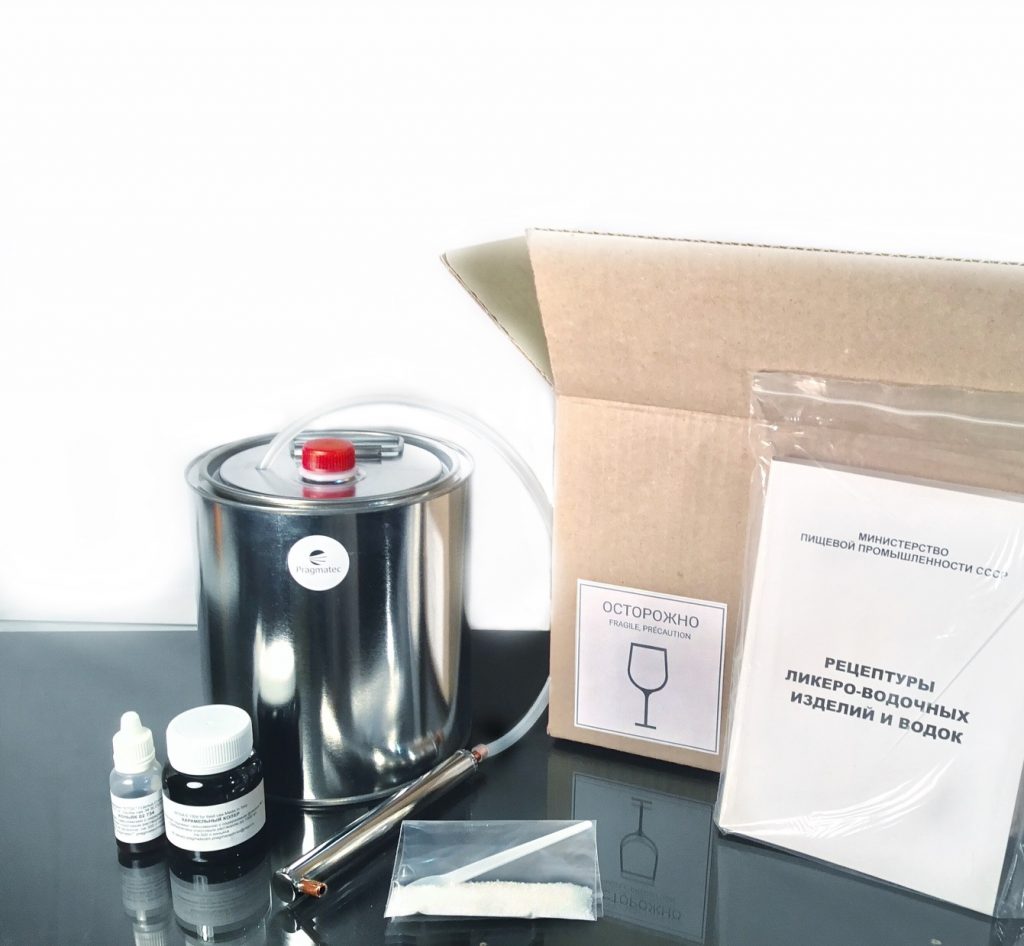 Itse tislaajan lisäksi sarja sisältää: puristin ja laippa, vesilukko, alkoholimittari, 4 m vesiputki (halkaisija 8 mm), puristimet, ohjain ja ohjevihko.