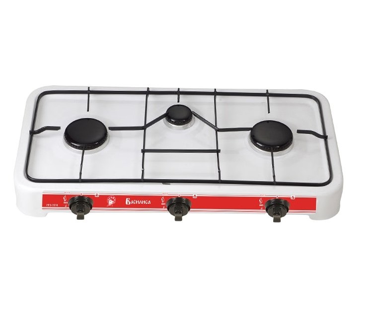 Kolmipolttinen pöytämalli kaasuliesistä emaloidusta teräksestä. Pkaasunsyöttöä säädellään pyörivillä kytkinmekanismeilla, arina astioiden asentamista varten on kiinnitetty polttimien yläpuolelle.