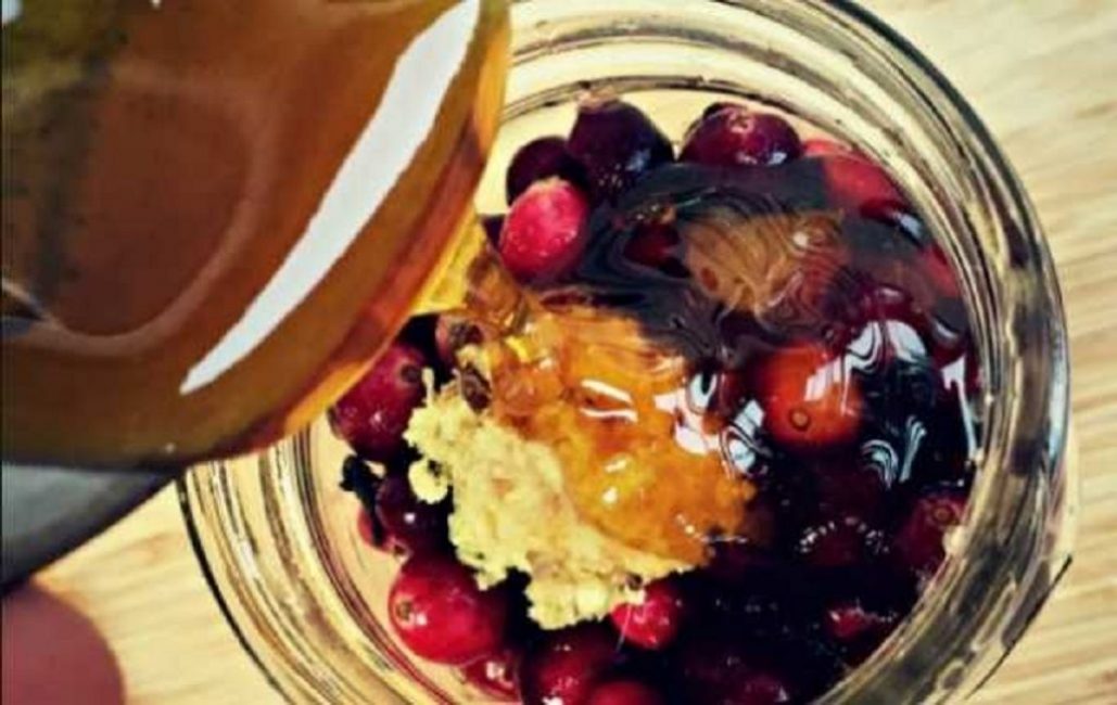 - Tarvittavat ainesosat valmistetaan: karpalot, valkosipuli, hunaja suhteessa 10:2:5