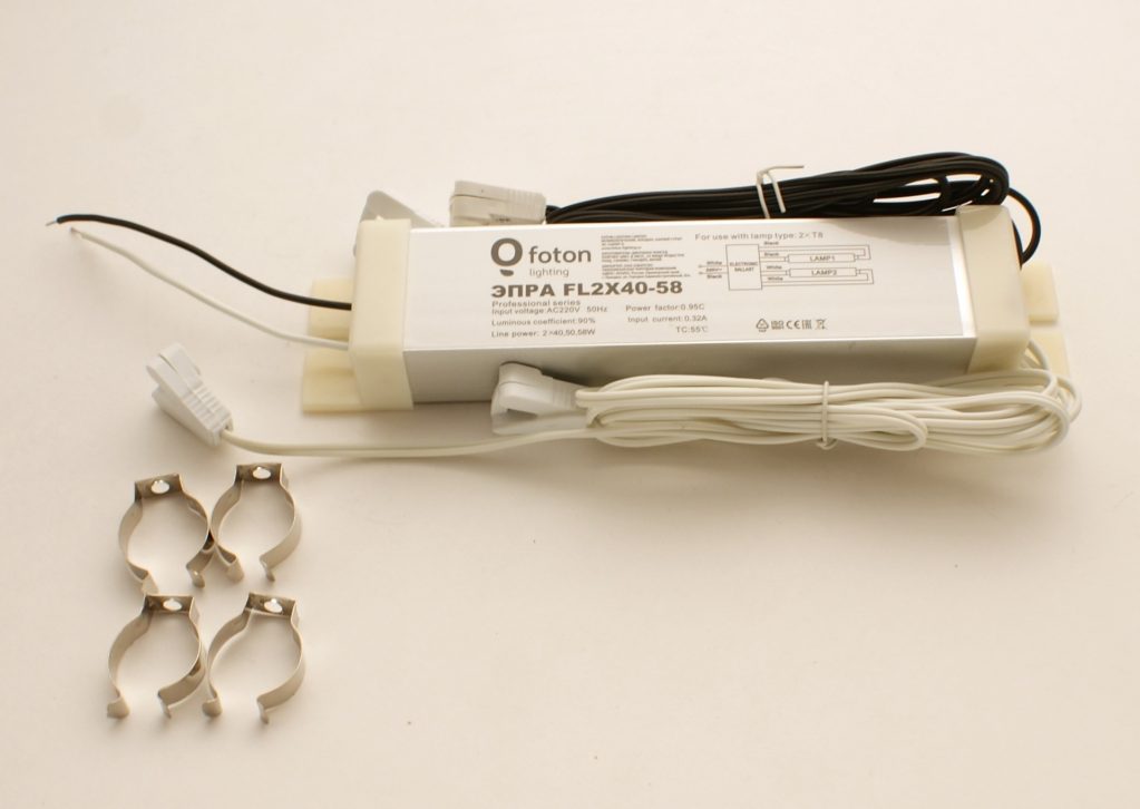 - Kiinnitämme tehoon valitun elektronisen liitäntälaitteen runkoon itsekierteitteillä ruuveilla. Jos lamppuja on kaksi, elektronisen mekanismin tehon tulisi olla 2 kertaa suurempi