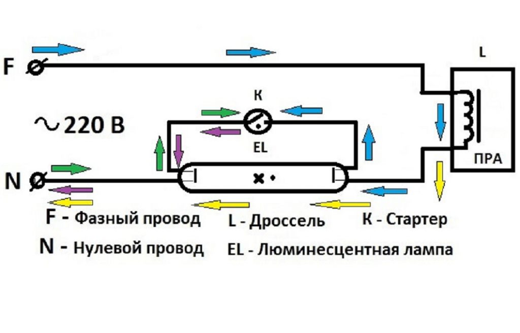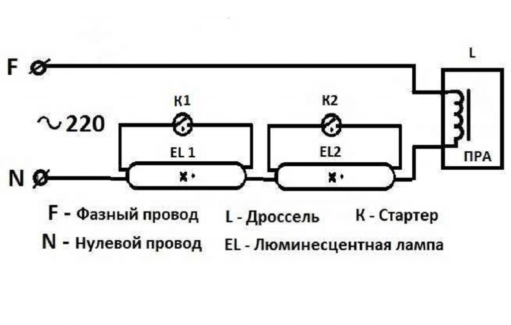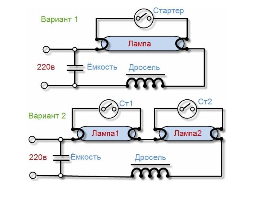 Loistelamppujen kytkentäkaaviot: kuristimella ja ilman, 2 tai useampia lamppuja (valokuva ja video)