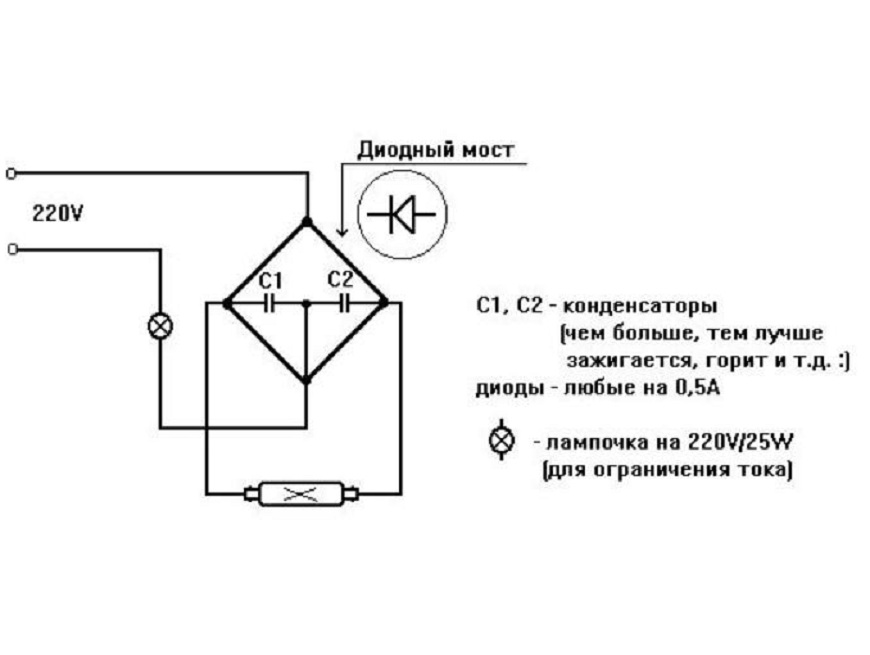 Jos haluat kytkeä loistelampun ilman kuristinta, on kytkettävä diodisilta (tai diodipari). Koskettimet suljetaan molemmilta puolilta pareittain. Valonlähteen toisella puolella tulee olla plus, toisella miinus.