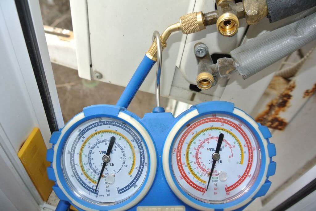 Kosteuden poistamiseksi järjestelmä tyhjennetään. Kytkemme ilmastointilaitteen tyhjiöpumppuun noin 1 tunnin ajaksi. Freon pumpataan järjestelmään tehtaalta, meidän on kytkettävä painemittari paineen hallitsemiseksi.