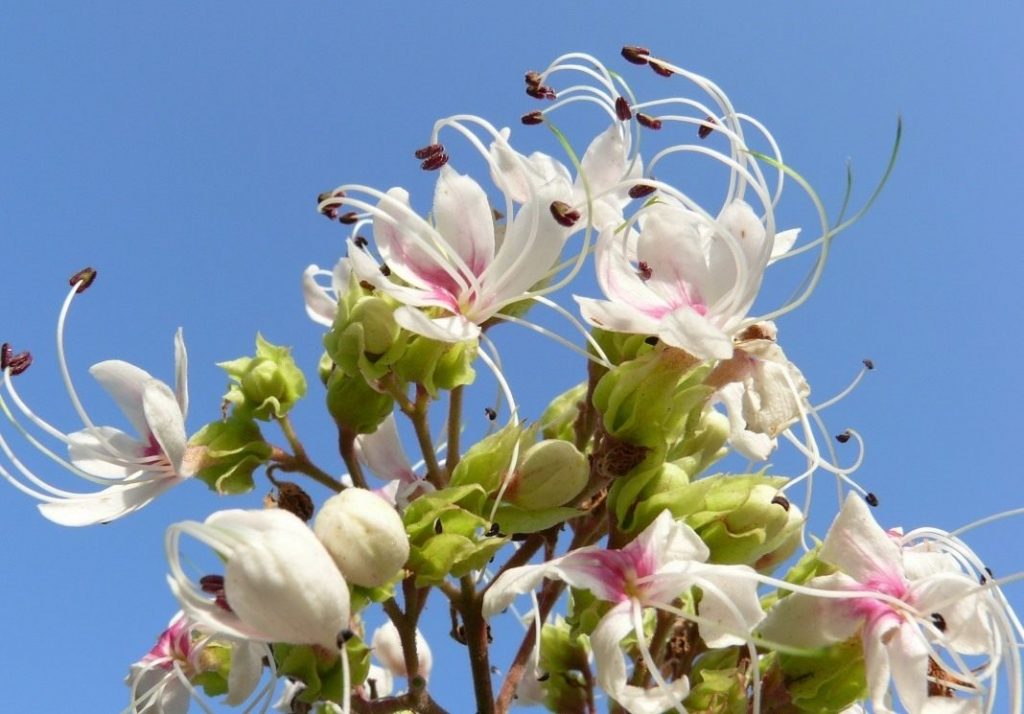 A hónalj virágzata vörös ecsetet alkot. A virágzás szinte egész évben tart.