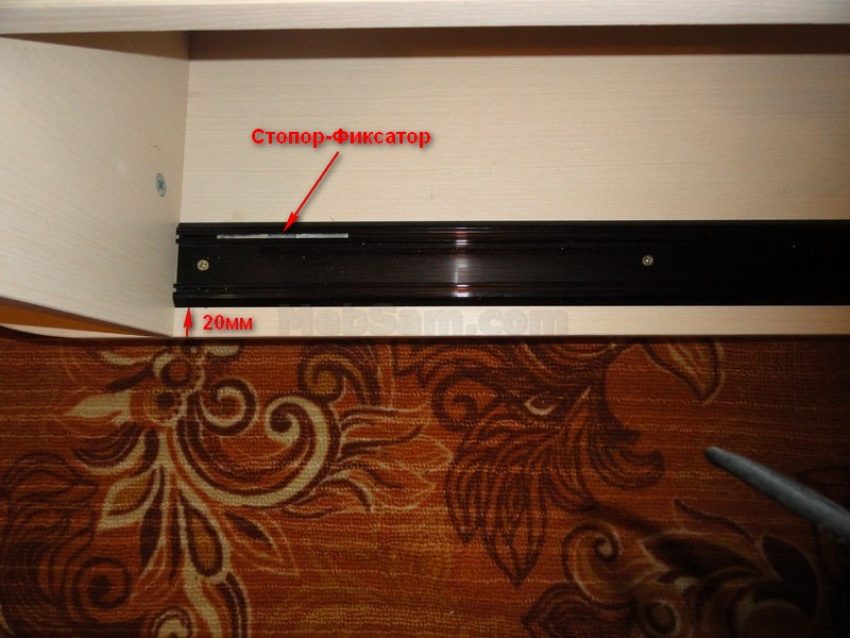 Det finns inga stora svårigheter med att montera proppen - innan du fixerar den nedre styrningen måste denna del helt enkelt sättas in i profilspåret med de delade delarna uppåt och sedan sträckas till önskad plats närmare väggen. Dess två fjädrande ändar ska vila tätt mot urtaget. En liten fördjupning är anordnad för ingången av rullen. I framtiden kan stoppets läge i förhållande till väggen justeras. Antalet proppar beror på antalet vingar - det vill säga de kommer att behöva tre i en tredörrars design, två i en tvådörrars design.